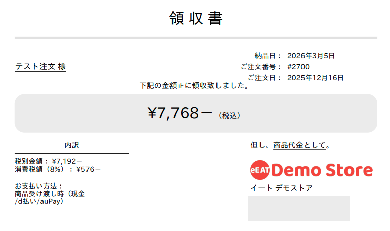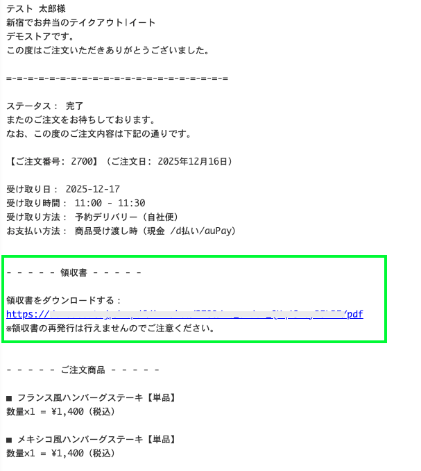 お客様が領収書を希望されている場合、PDFの領収書データが完了メールからダウンロードできます。