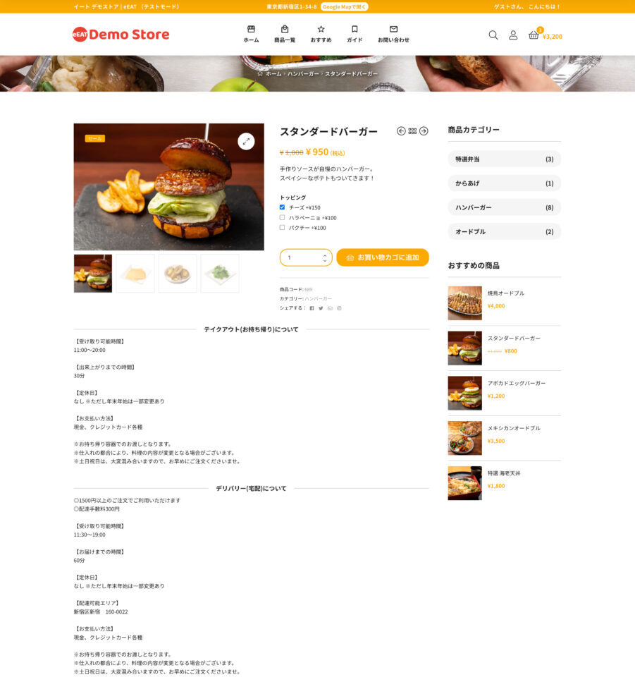 商品の詳細ページです。オプション選択肢でトッピングなどの設定が可能です。設定方法はこちら。