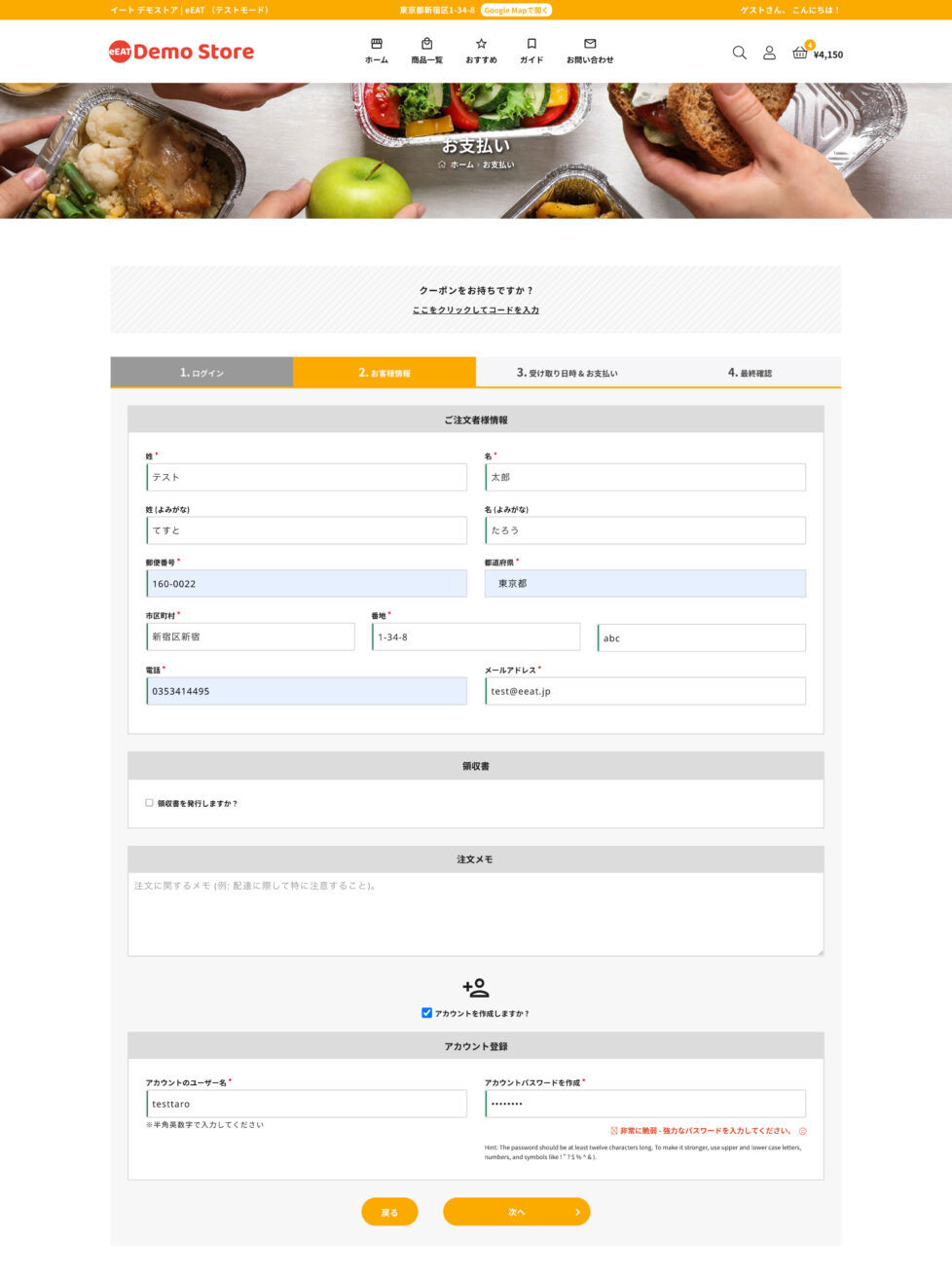 ゲスト購入の方はこの画面でアカウントを作成できます。アカウントを作れば次回以降は注文者情報の入力を省略できます。